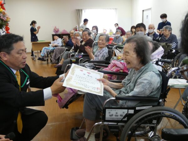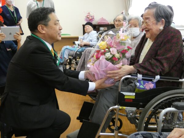 菅原理事長よりご祝辞を申し上げ、最高齢の男性99歳、女性103歳の2名をはじめとし、百寿1名、白寿1名、卒寿6名、米寿5名、傘寿1名、計15名の方へ表彰状と敬老祝い品、家族会より贈られたお花が手渡されました。