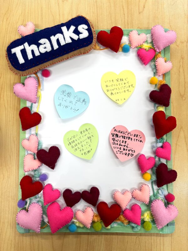 こちらの、とても素敵なボードの飾りは、職員の手作りです!感謝第1号ですね!